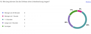 Grundsätzlich sind alle Patientinnen und Patienten, die Herr Gruber, unser Orthopädietechnikermeister, und ich in den letzten zwölf Monaten versorgt haben, sehr zufrieden (4). Allerdings sollte man auf einige Dinge hinweisen: eine ununterbrochene Anwendung, die für eine optimale Wirkung vielleicht die besten Voraussetzungen schaffen würde, toleriert man normalerweise nicht. Einerseits beklagen viele Patienten einen gewissen Druckschmerz an der Stelle, wo der Stützblock aufliegt, also über dem streckseitigen Grundglied. Andererseits ist die Schiene an sich für viele Tätigkeiten zu hinderlich. Deshalb wenden die Patienten die Orthese nur stundenweise an. Trotzdem haben viele Patienten einen positiven Effekt beschrieben.